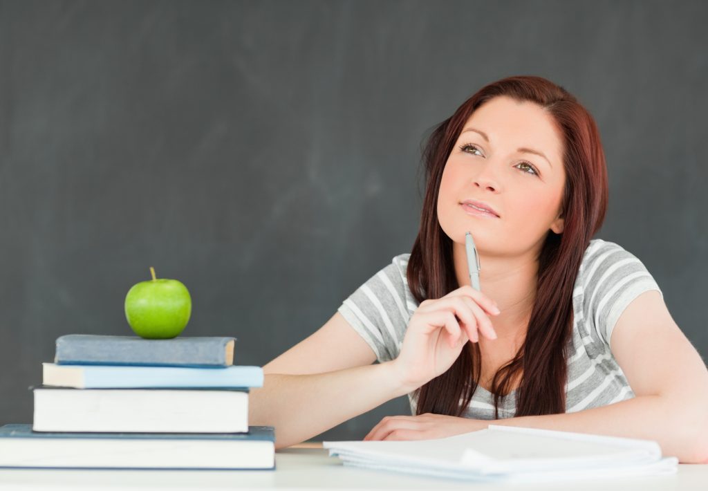 Young student writting an essay in a classroom